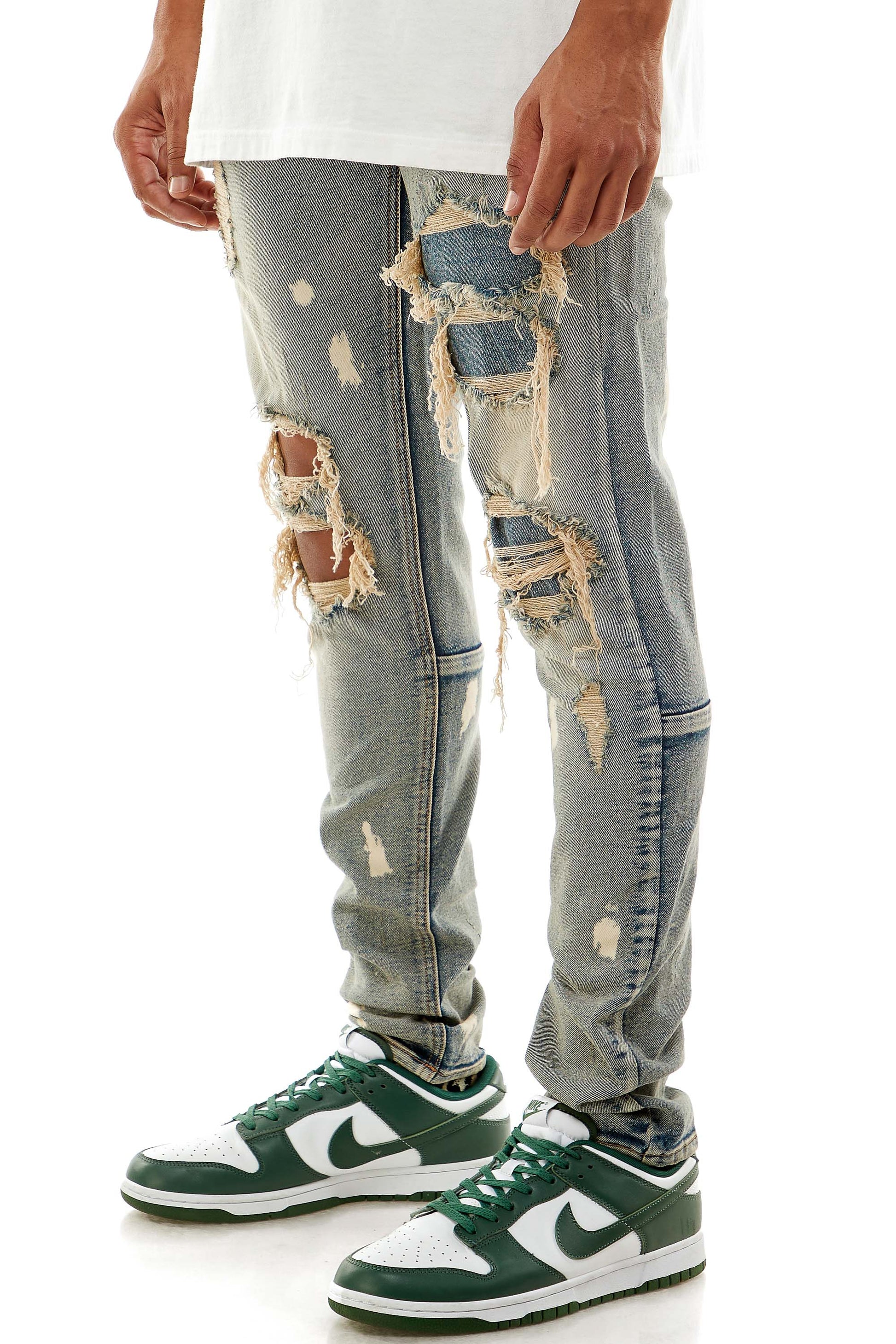 Distressed rips on thighs and knees w/ denim patches inside