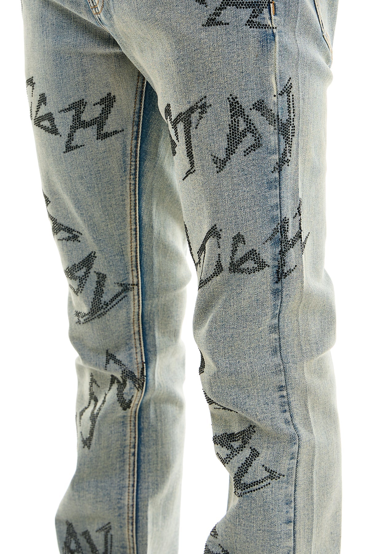 - Unique Rhinestone Lettering: Features bold, handwritten-style rhinestone text down the legs for a truly one-of-a-kind look.