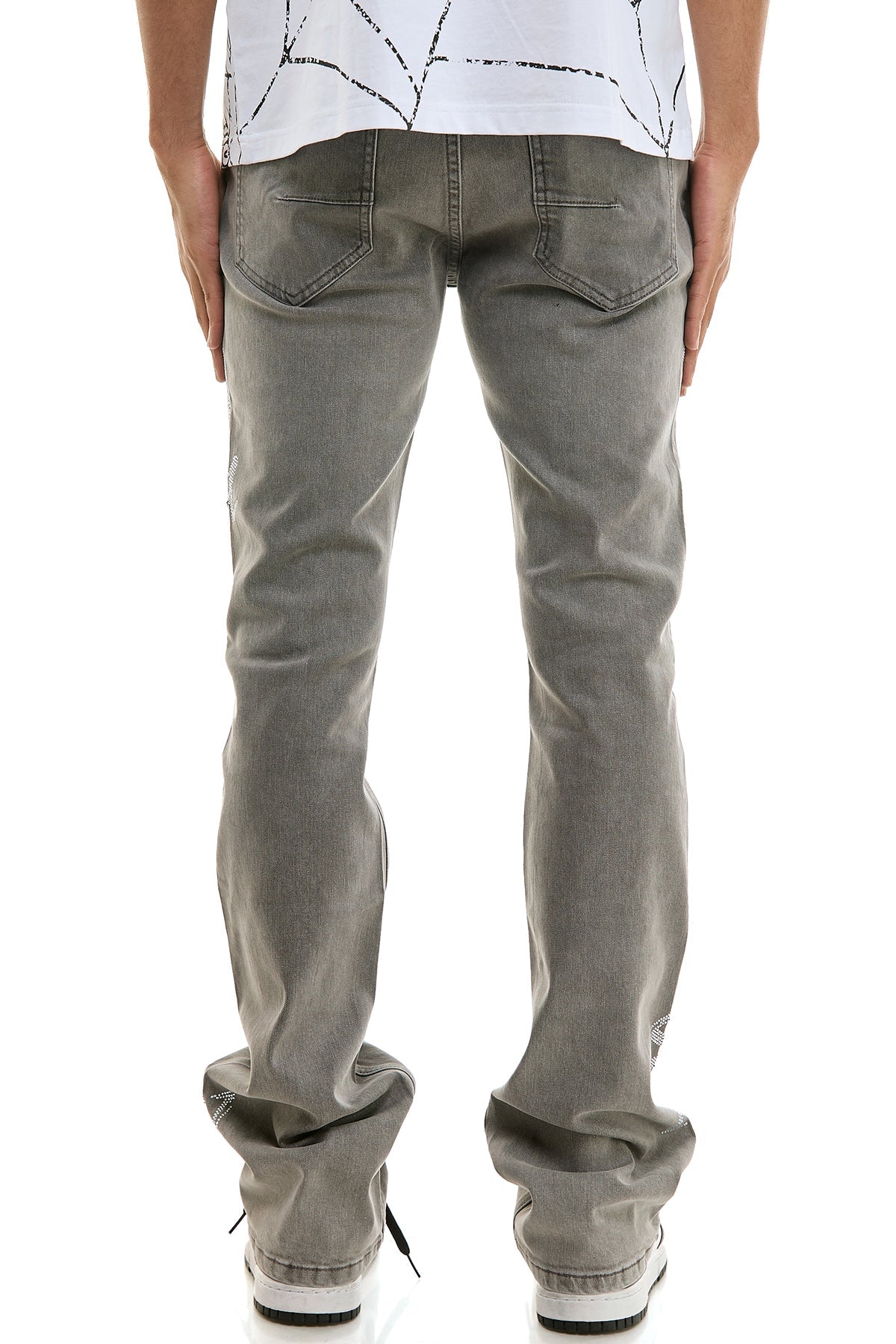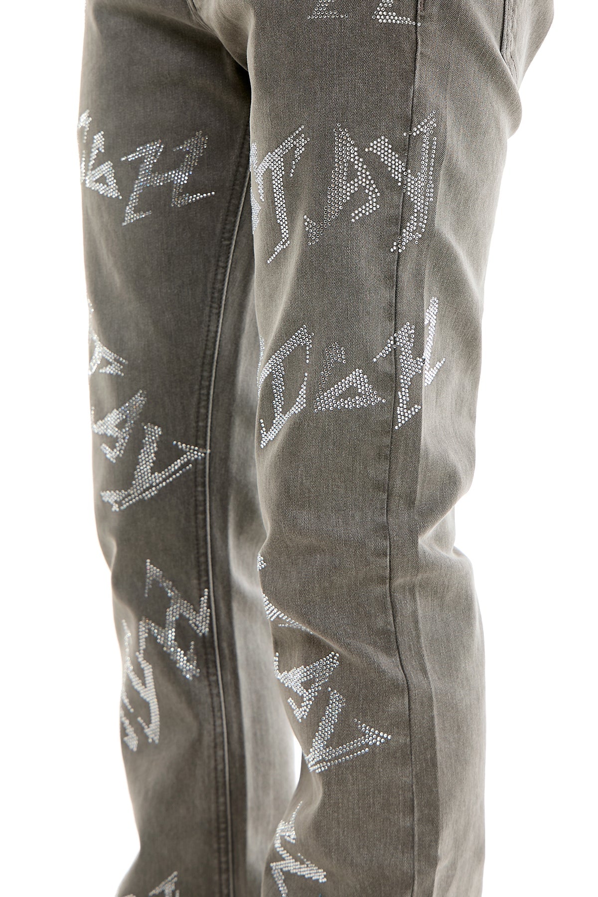 Express your style with the KDNK Stay High Rhinestone Skinny Flare Jeans, a unique and bold piece designed for those who want to make a statement. These exceptional men's rhinestone jeans are crafted from a premium 98% Cotton 2% Spandex stretch denim, providing superior comfort and a flexible fit that moves with you. The defining feature is the mesmerizing, handwritten-style rhinestone lettering that runs down the legs, creating a dazzling sparkle that contrasts beautifully against the medium grey denim. Engineered with a contemporary skinny flare fit, these rhinestone skinny jeans hug the leg closely before expanding into a dramatic flare at the ankle, achieving the perfect stacked silhouette over your favorite sneakers. Each pair comes complete with the signature KDNK brand tag, guaranteeing genuine quality and a unique design.
