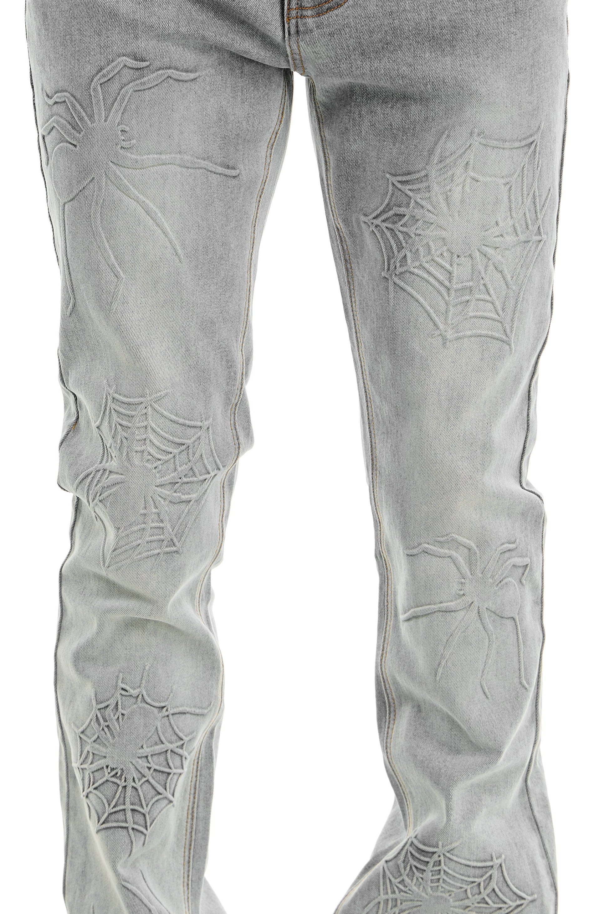 Unleash a new level of streetwear with the KDNK Grey Spiderweb Skinny Flare Jeans, a dynamic and original piece designed for those who dare to stand out. These unique men's spider jeans are crafted from premium 98% Cotton 2% Spandex stretch denim, providing superior comfort and flexible movement. The defining feature is the intricate, embroidered spiderweb design that creates a detailed, haunting look down the leg. The washed-out grey denim gives these jeans a worn-in, effortless feel. Engineered with a contemporary skinny flare fit, they hug the leg from the hip to the knee before expanding into a dramatic flare at the ankle, achieving a perfect, stacked silhouette over your favorite sneakers. Each pair comes complete with the signature KDNK brand tag, guaranteeing genuine quality and cutting-edge design.